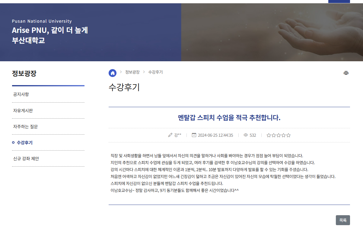 지인의 추천으로 스피치 수업에 관심을 두게 되었고, 여러 후기를 검색한 후 이남호교수님의 강의를 선택하여 수강을 하였습니다.