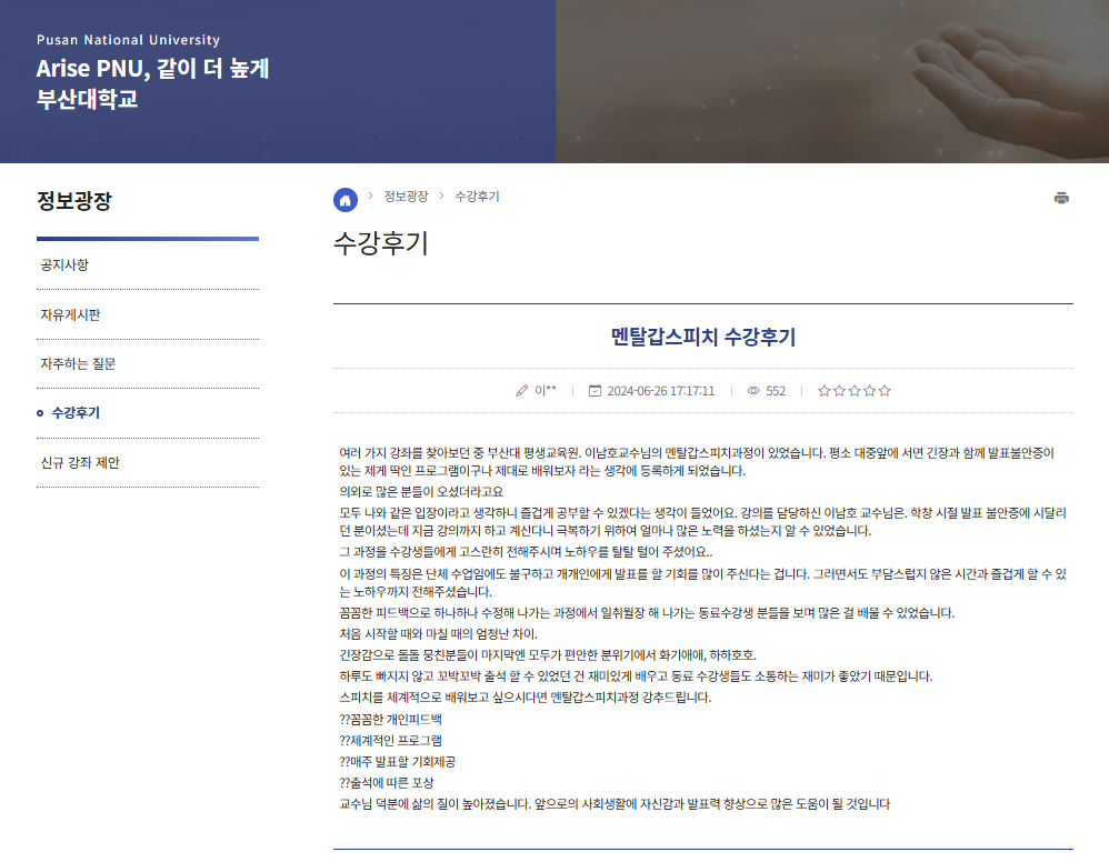 여러 가지 강좌를 찾아보던 중 부산대 평생교육원. 이남호교수님의 멘탈갑스피치과정이 있었습니다. 평소 대중앞에 서면 긴장과 함께 발표불안증이 있는 제게 딱인 프로그램이구나 제대로 배워보자 라는 생각에 등록하게 되었습니다.