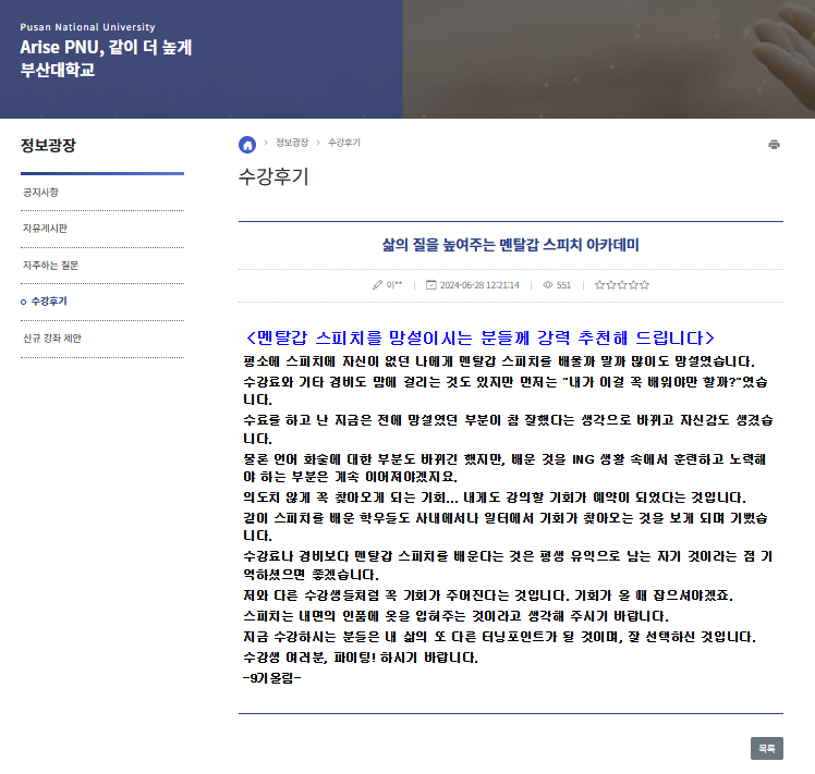 수강료나 경비보다 멘탈갑 스피치를 배운다는 것은 평생 유익으로 남는 자기 것이라는 점 기억하셨으면 좋겠습니다.