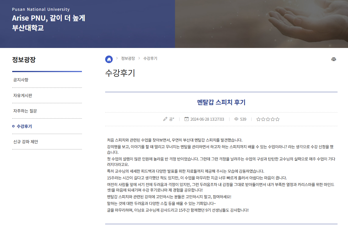 처음 스피치와 관련된 수업을 찾아보면서, 우연히 부산대 멘탈갑 스피치를 발견했습니다.